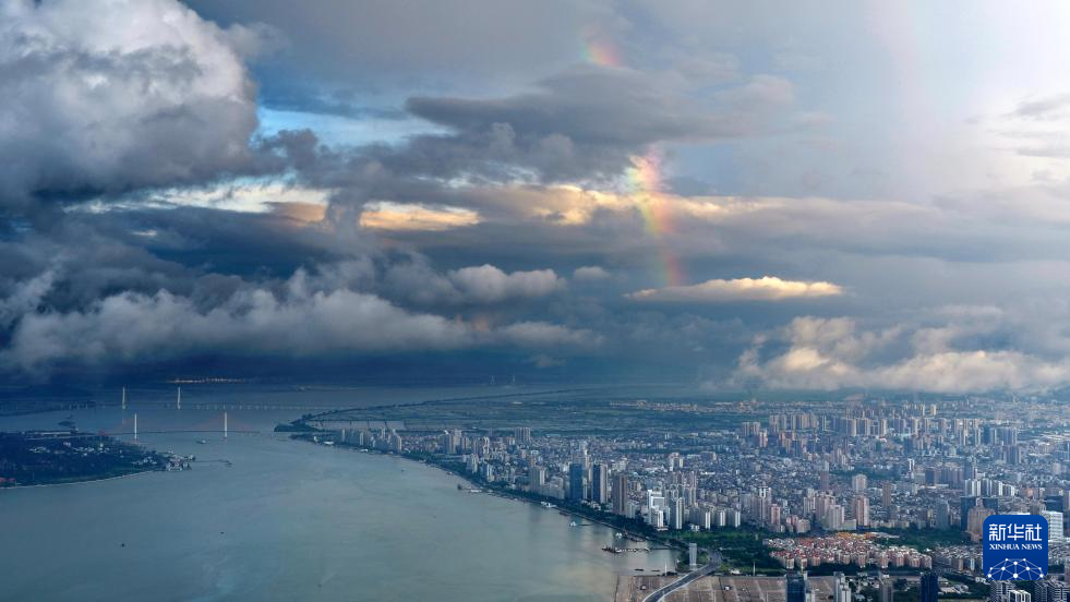 6月30日,在广东汕头城市上空,雨后出现彩虹(无人机照片)。