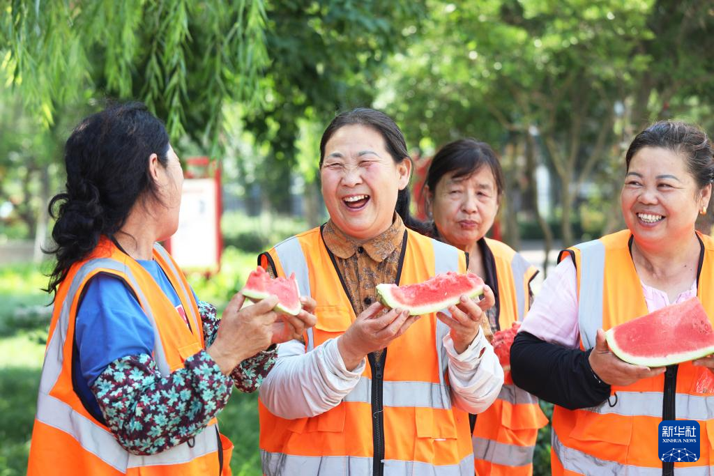 7月22日,河北省唐山市丰润区环卫工人分享志愿者送来的西瓜。