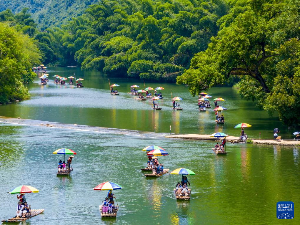 7月31日,人们在广西桂林市阳朔县遇龙河乘坐竹筏漂流(无人机照片)。