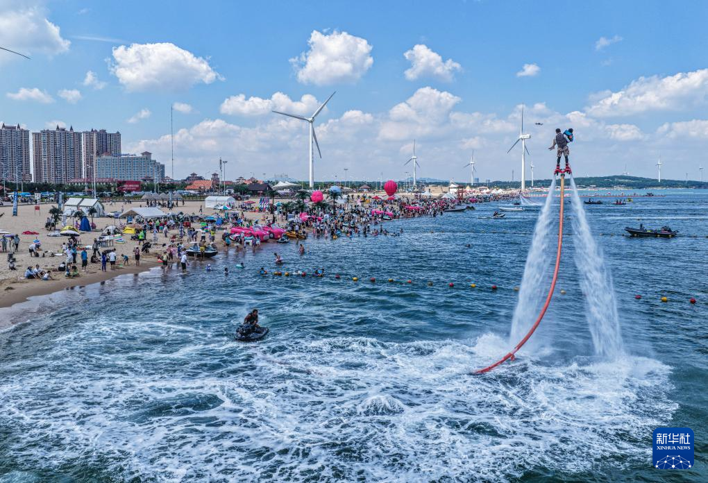 7月24日,在山东省荣成市那香海国际旅游度假区,游客体验“水上飞人”(无人机照片)。