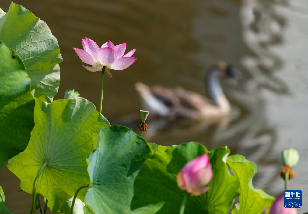 7月7日,在贵州省铜仁市玉屏侗族自治县皂角坪街道枹木垅村,一只鹅从荷花旁游过。