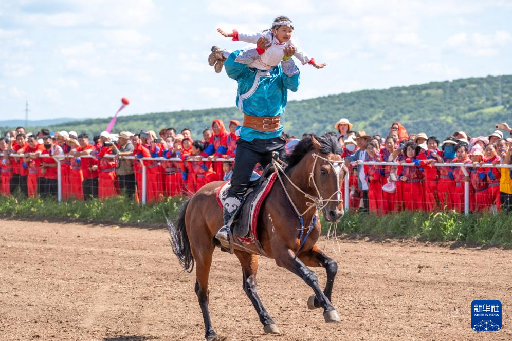 8月7日,演员在农牧民那达慕大会上表演马术。