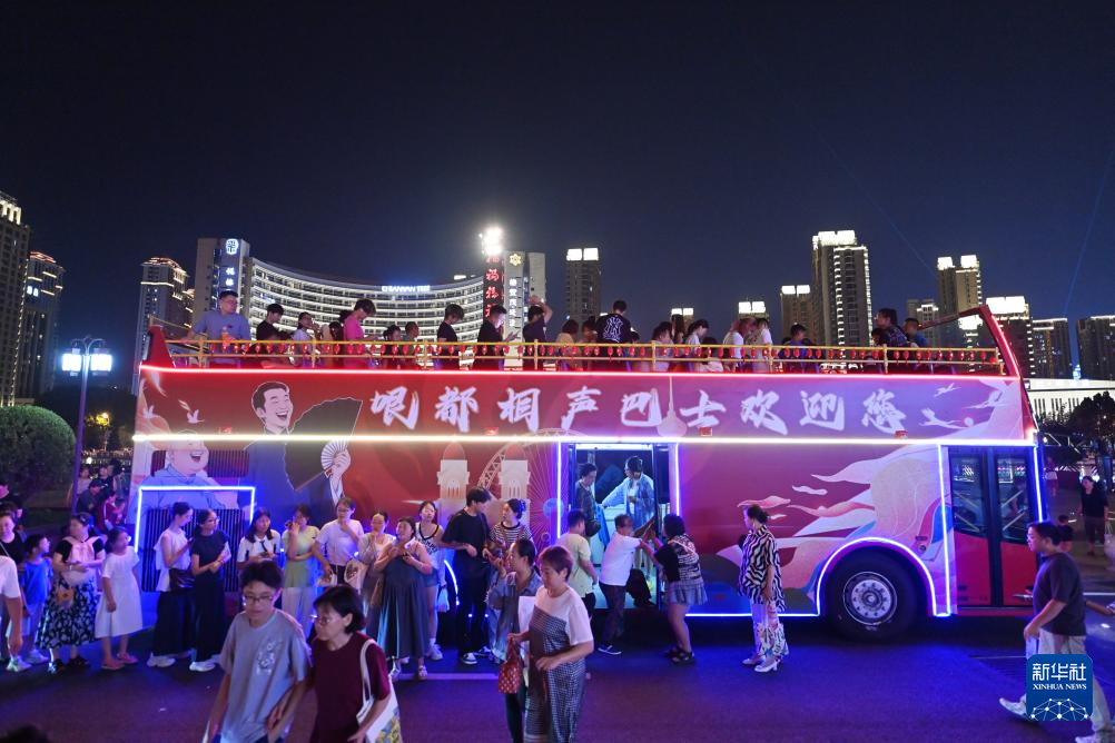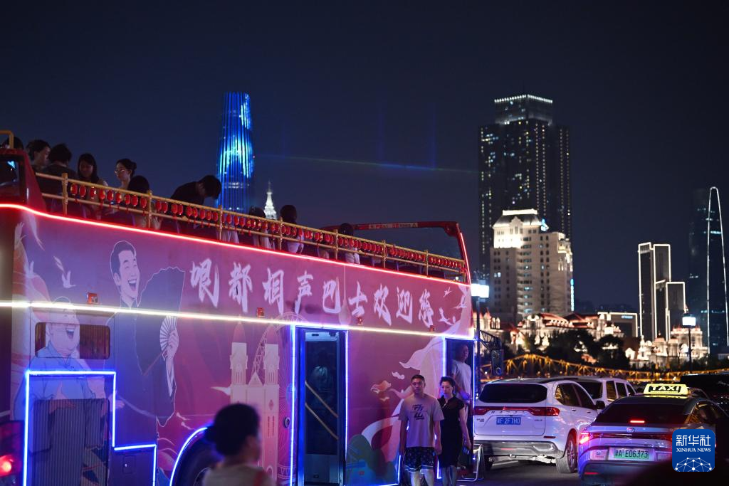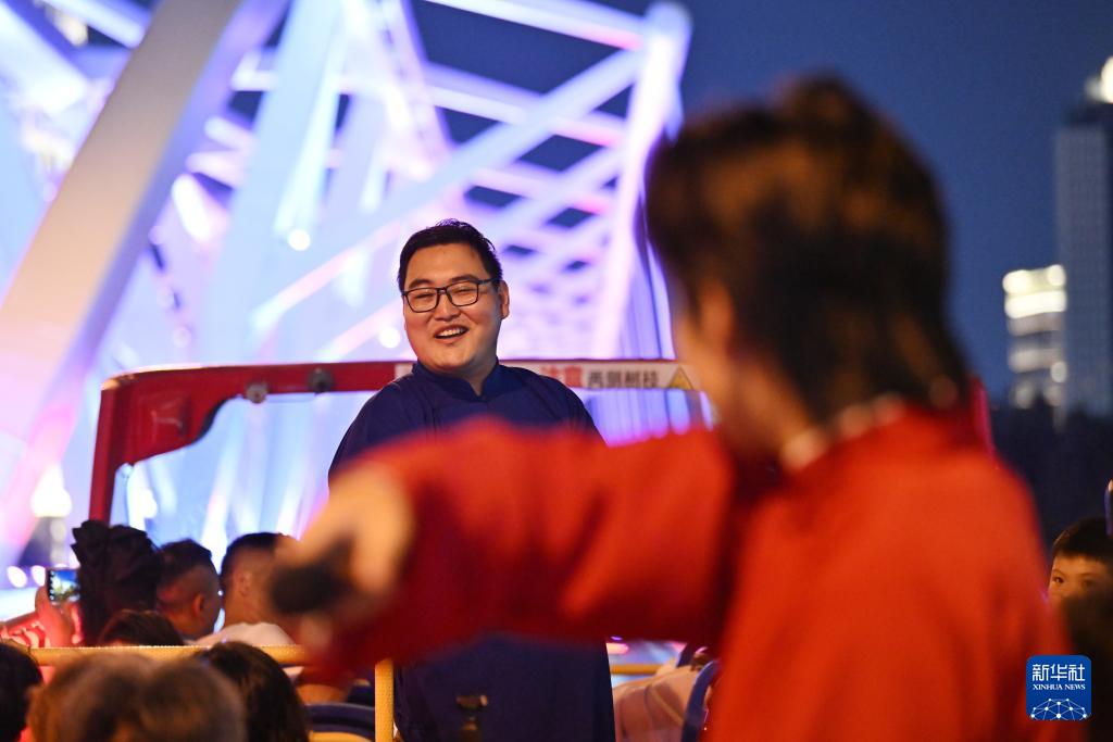 华灯初上,在天津市中心城区的海河岸边,一辆满载欢声笑语的双层“相声巴士”往来穿梭于古文化街、“天津之眼”摩天轮等地标景点间,为游人带来全新的夜游体验。
