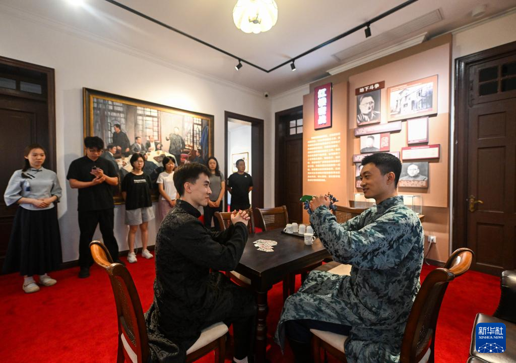演员在吉鸿昌旧居实景演绎“光荣入党”片段(8月16日摄)。