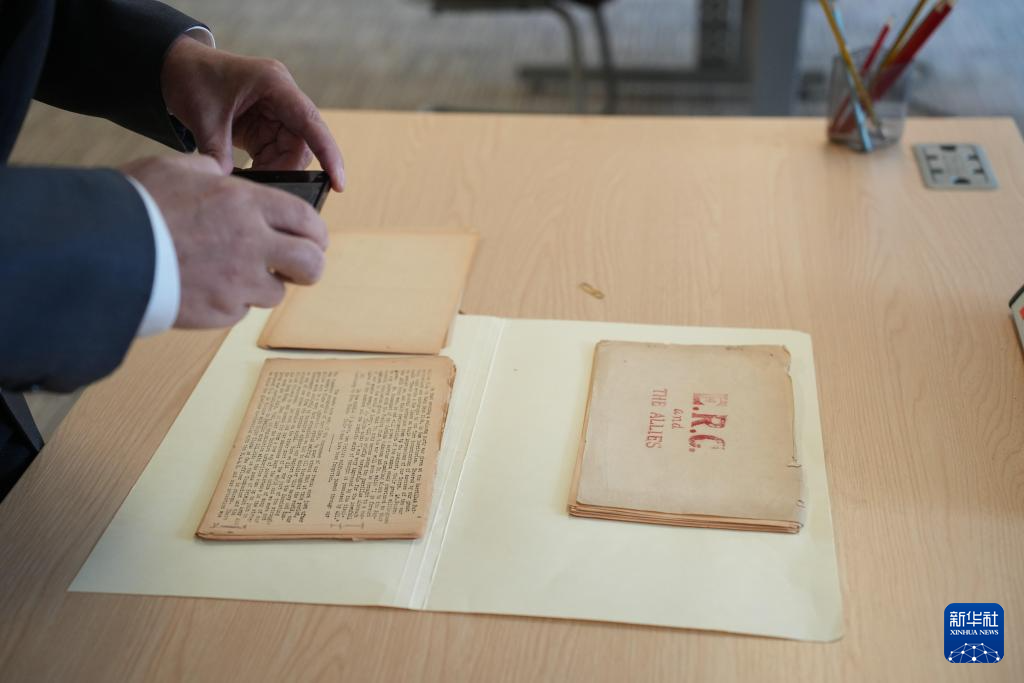 这是8月21日在位于英国曼彻斯特市的人民历史博物馆拍摄的由曾参加东江纵队的新华社伦敦分社首任社长黄作梅主笔编撰的东江纵队援救盟军人员的档案资料。新华社记者 吴黎明 摄