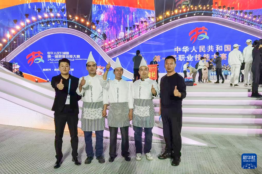 热西提(左三)作为展演嘉宾参加第一届全国技能大赛“中华绝技”现场展演后拍照留念(资料照片)。
