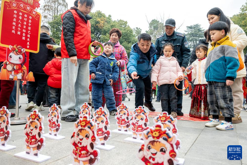 2月4日,在浙江省湖州市长兴县雉城街道古城公园,社区居民参与“马年套圈圈福气”趣味体验活动。