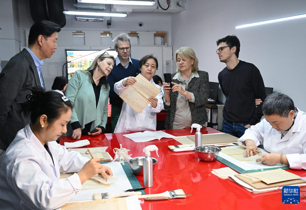 4月2日,参加中意文化遗产保护修复国际圆桌会议的意方专家在位于北京的中国历史研究院图书档案馆文献修复室参观了解该馆古籍修复技术。