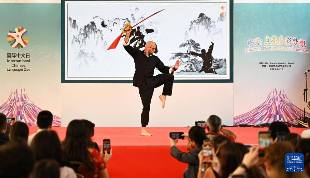 4月15日,在巴西里约热内卢天主教大学举办的“国际中文日”庆祝活动上,巴西男子表演中国武术。