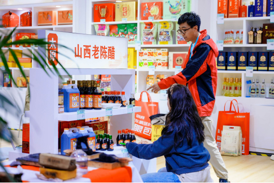 作为本届展会的亮点之一,山西馆由山西省商务厅牵头组织汇聚208家名优企业,携千余种商品精彩亮相。展馆设计匠心独运,深刻融入山西“表里山河”的地理特征与“地上博物馆”的文化底蕴,将大同云冈石窟、朔州应县木塔、忻州五台山、太原晋祠、晋中晋商大院、临汾壶口瀑布、运城关公等极具代表性的文化地标符号,与汾酒、老陈醋、平遥牛肉、沁州黄小米、闻喜煮饼、推光漆器、澄泥砚、紫砂壶、剪纸等特色特产与非遗手作有机融合,分区错落有致,为观众开启了一段沉浸式的三晋文化旅程。山西馆突破传统静态展示模式,着力打造可互动、可体验、可打卡的亮点区域。观众可通过集章打卡换取纪念品,免费试吃试饮地方美食,欣赏精彩的面艺非遗表演,亲身体验剪纸等非遗手作乐趣。这种全感官的互动设计,为观众带来沉浸式逛展体验,极大增强了山西馆的互动性和趣味性。