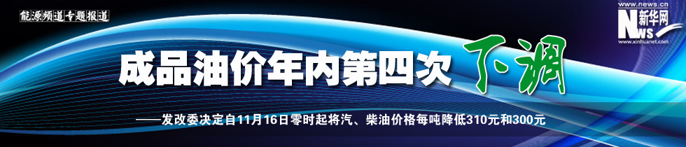 發改委決定自11月16日零時起將汽、柴油價格每噸降低310元和300元,折算到90號汽油和0號柴油(全國平均)每升零售價分降0.23元和0.26元。 [詳細]
