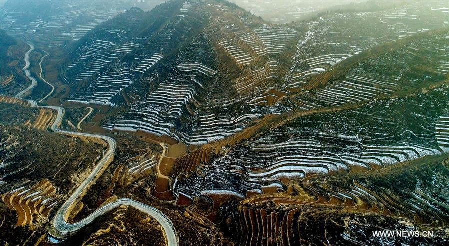 Photo taken on Dec. 15, 2017 shows scenery of terraced fields covered by snow in Shexian County, north China's Hebei Province. (Xinhua/Mu Yu)?
