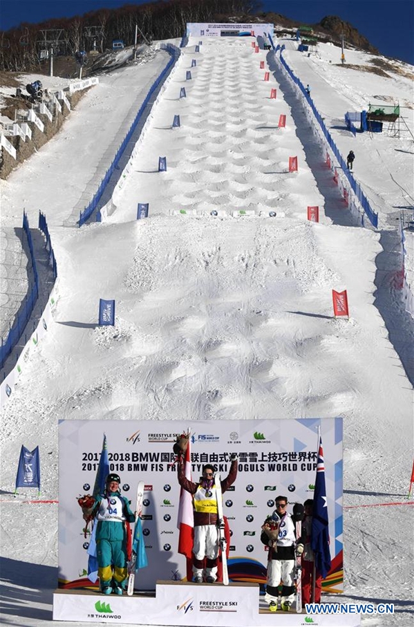 Winner Mikael Kingsbury of Canada, runner-up Dmitriy Reikherd (L) of Kazakhstan and the third-place winner Matt Graham of Australia celebrate after the men's Moguls on the Day 2 of the 2017-2018 Freestyle Skiing World Cup-Moguls & Aerials at the Thaiwoo ski resort in Chongli District of Zhangjiakou City, north China's Hebei Province, Dec.22, 2017. (Xinhua/Wang Xiao)