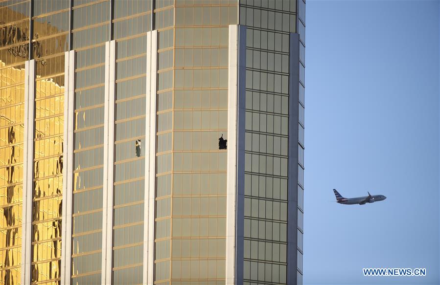 Photo taken on Oct. 3, 2017 shows the broken windows of Mandalay Bay Hotel in Las Vegas, the United States. (Xinhua/Wang Ying)