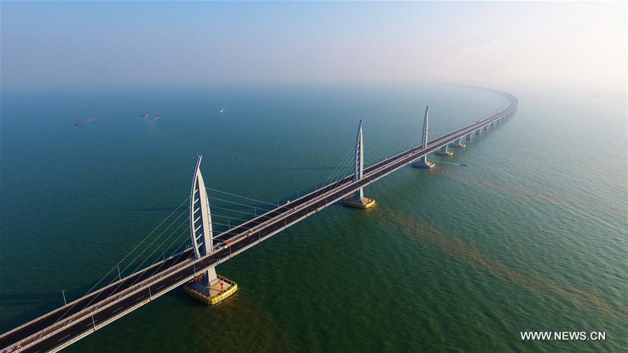 Aerial photo taken on Dec. 27, 2017 shows the Hong Kong-Zhuhai-Macao Bridge in early morning, south China's Guangdong Province. The major work of the world's longest sea bridge was completed Sunday as scheduled, after its lighting system was installed and tested. It took six years preparation, and eight years to build the 55-kilometer-long bridge linking Hong Kong, Zhuhai and Macao. In the next month, engineers and constructors will test the coordination of the bridge's various systems and equipment, and proceed with inspection and cleaning work. The bridge will slash travel time between Hong Kong and Zhuhai from three hours to just 30 minutes, further integrating cities in the Pearl River Delta. (Xinhua/Liang Xu)