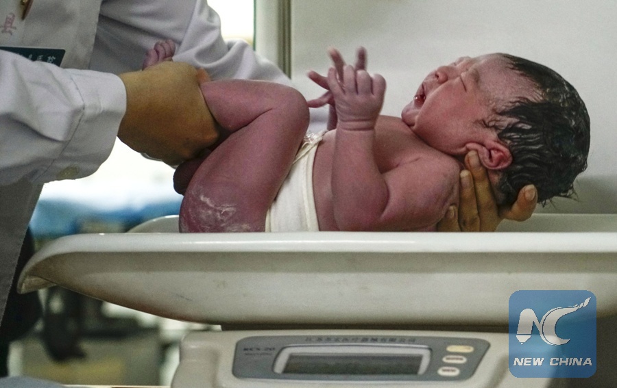 File Photo: A new born baby is weighed at the Anxin county hospital in Xiongan New Area, north China's Hebei Province, Oct. 1, 2017. (Xinhua/Xing Guangli)