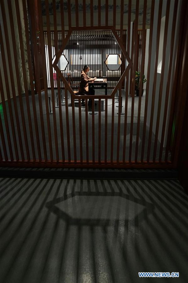 A staff member shows the usage of "four treasures of a Chinese studio" at National Museum of Classic Books in Beijing, capital of China, Jan. 11, 2018. National Museum of Classic Books held an exhibition featuring the art of Chinese studio and the life of a traditional Chinese scholar. The exhibition introduced the craftsmanship and history of the "four treasures of a Chinese studio". (Xinhua/Yin Gang)