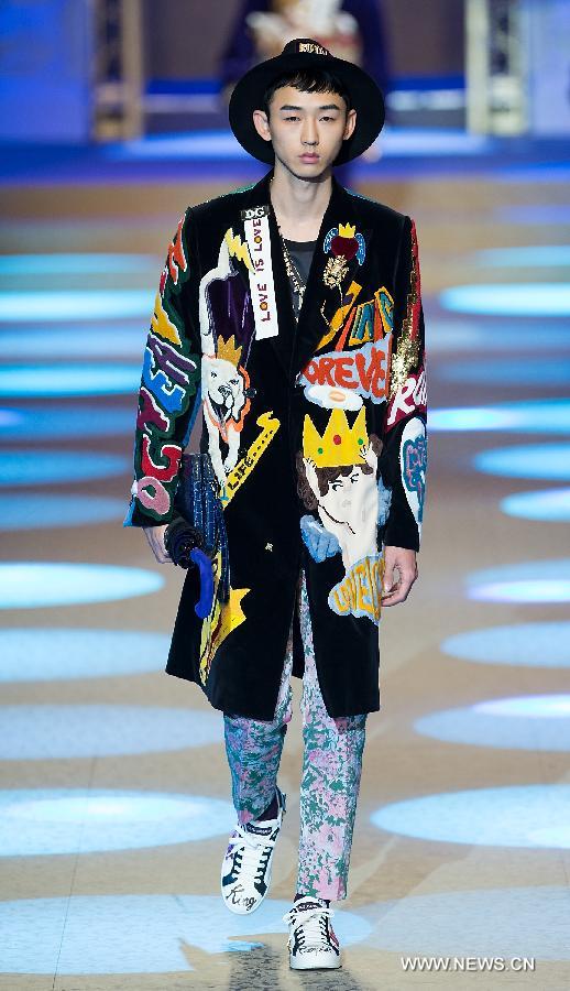 A model presents creations for fashion house Dolce&Gabbana during Milan Men's Fashion Week Fall/Winter 2018/19 in Milan, Italy, Jan. 13, 2018.(Xinhua/Jin Yu)