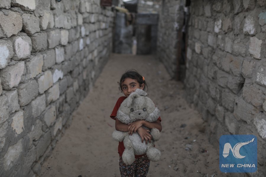 A Palestinian refugee child plays outside her house at Khan Younis refugee camp in southern Gaza Strip, on Aug. 8, 2017. About 2 million people reside in the Gaza Strip, where over 1.2 million refugees are registered. (Xinhua/Wissam Nassar)