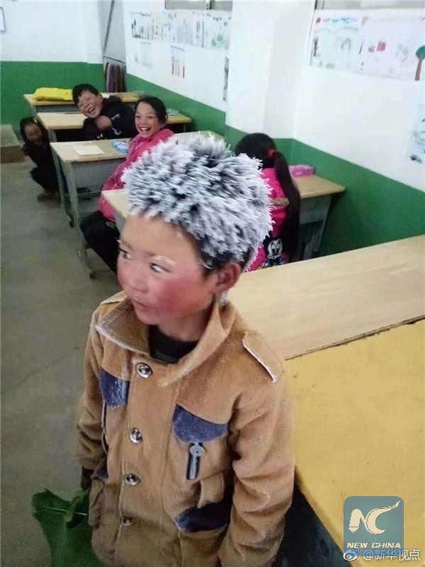 Third-grader Wang Fuman received his frosted look and chapped cheeks after a 4.5-km walk from his home to school on a freezing day in Ludian County, a rural area in southwest China's Yunnan.