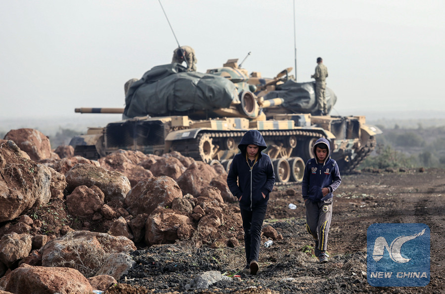Two boys walk by Turkish army tanks in Afrin, Syria, on Jan. 22, 2018. Turkey launched on Jan. 20 a new operation dubbed as "Operation Olive Branch" on the ground to oust Kurdish militia from Syria's Afrin. (Xinhua photo)