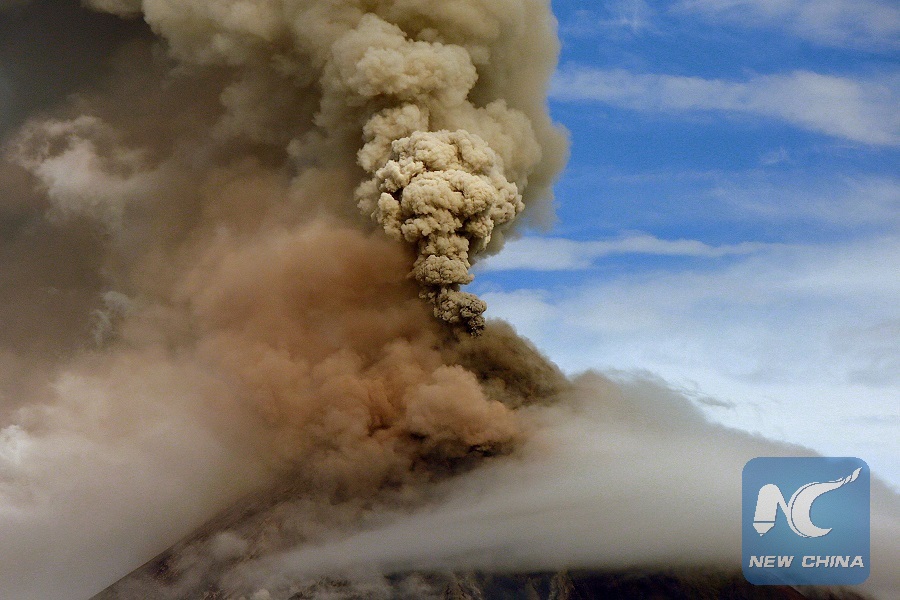 Huge plumes of smoke are seen as Mayon volcano erupts in Albay Province, the Philippines, Jan. 25, 2018. (Xinhua/Rouelle Umali)