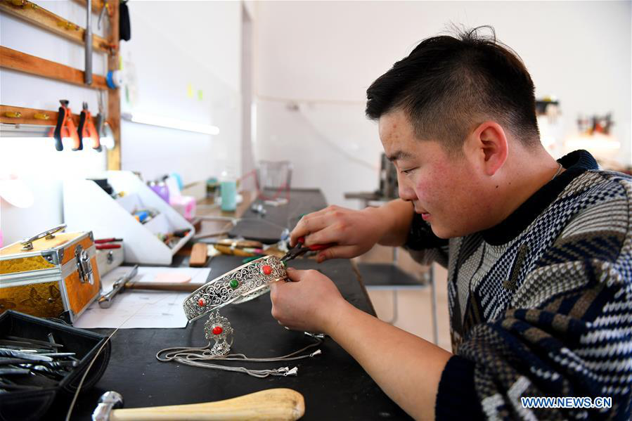 An entrepreneur of Mongolian ethnic group makes silver ornaments at a business incubator base in Hexigten Qi, north China's Inner Mongolia Autonomous Region, Jan. 10, 2018. Local government of Hexigten Qi has provided free training on traditional handicraft to the unemployed, graduates and impoverished family since 2017. (Xinhua/Deng Hua)