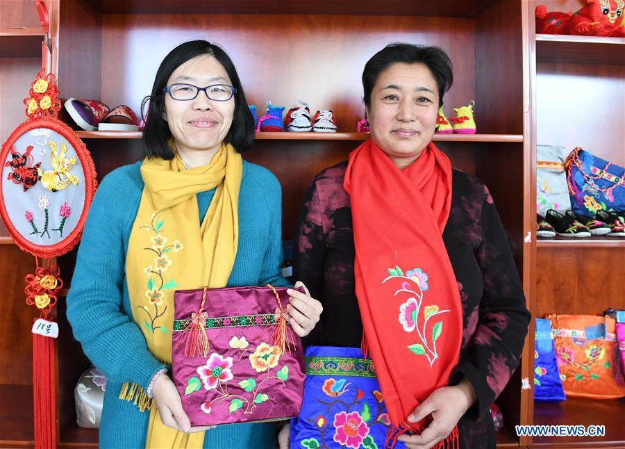 People show Mongolian embroidery works at a business incubator base in Hexigten Qi, north China's Inner Mongolia Autonomous Region, Jan. 10, 2018. Local government of Hexigten Qi has provided free training on traditional handicraft to the unemployed, graduates and impoverished family since 2017. (Xinhua/Deng Hua)
