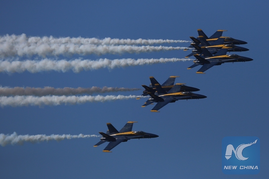 The U.S. Navy Blue Angels fly over the Golden Gate Bridge in an air show of the annual Fleet Week activities in San Francisco, the United States, on Oct. 7, 2017. (Xinhua/Liu Yilin)