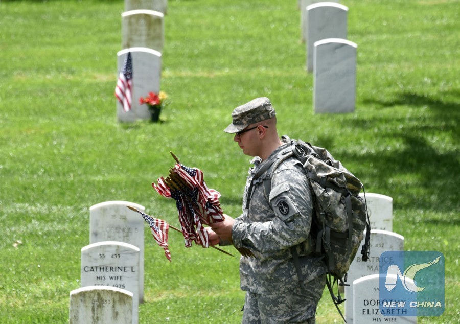 A soldier from the 3rd U.S. Infantry Regiment places flags at grave sites during the "Flags-In" ceremony at the Arlington National Cemetery in Arlington, Virginia, the United States, on May 25, 2017. (Xinhua/Yin Bogu)