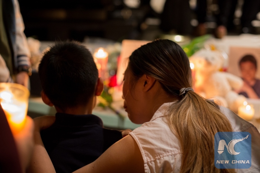 Photo of Peter Wang, a Chinese American victim, is placed during a vigil for the victims of the shooting at Marjory Stoneman Douglas High School, in Pine Trails Park in Parkland, Florida, the United States, on Feb. 15, 2018. (Xinhua/Monica McGivern)