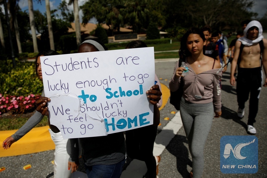 Students from West Boca Raton Community High School carry a placard as they walk to Marjory Stoneman Douglas High School, during a protest to show support, following a mass shooting in Parkland, Florida, U.S., Feb. 20, 2018. (Xinhua/REUTERS)