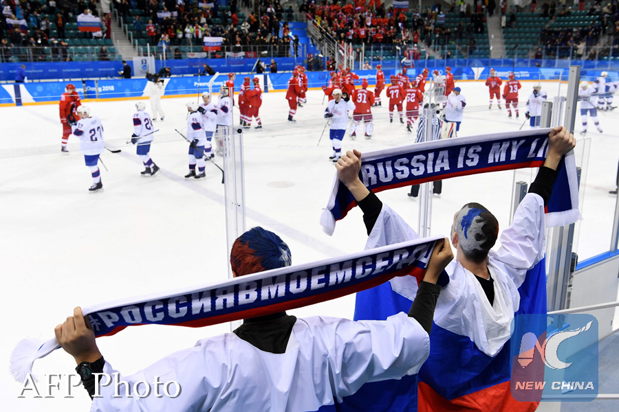 Russian fans react after the men's quarter-final ice hockey match between Norway and the Olympic Athletes from Russia (OAR) during the Pyeongchang 2018 Winter Olympic Games at the Gangneung Hockey Centre in Gangneung on February 21, 2018. (AFP PHOTO)