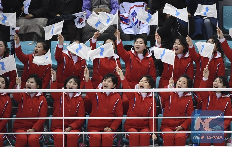 Cheerleaders from the Democratic People's Republic of Korea (DPRK) cheer before the preliminary match of women's ice hockey between Switzerland and the unified team of DPRK and South Korea at the Pyeongchang 2018 Winter Olympic Games at the Kwandong Hockey Centre in Gangneung, South Korea, on Feb. 10, 2018. (Xinhua/Wang Song)