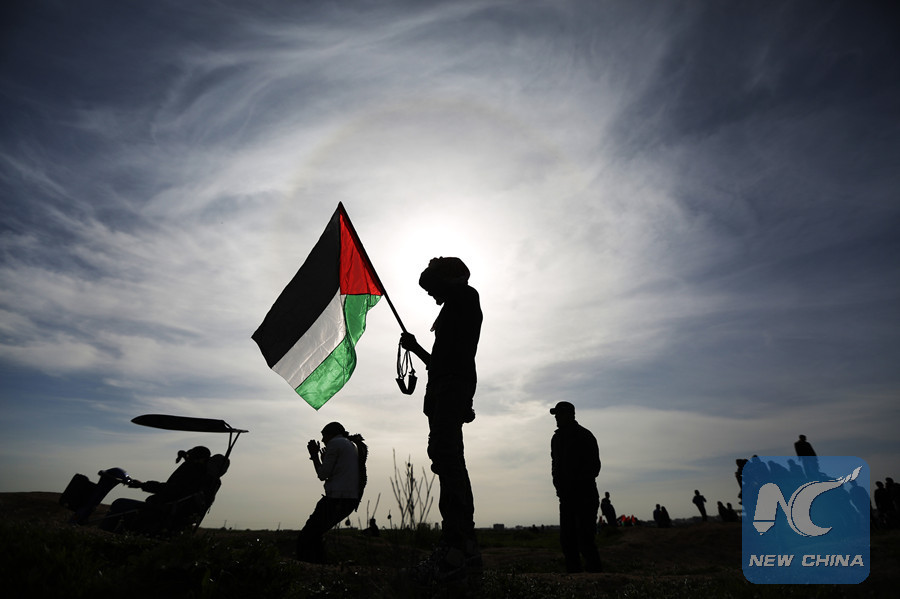 A Palestinian protester holds a Palestinian flag during clashes with Israeli troops near the border between Israel and east Gaza Strip, on March 2, 2018. (Xinhua/Wissam Nassar)