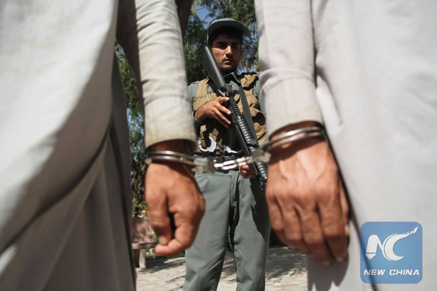 Suspected Taliban militants stand handcuffed in Jalalabad city, Nangarhar province, Afghanistan, Sept. 18, 2017. Afghan security personnel captured 13 suspected Taliban militants during an operation in Nangarhar province, a local official said. (Xinhua/Rahman Safi)