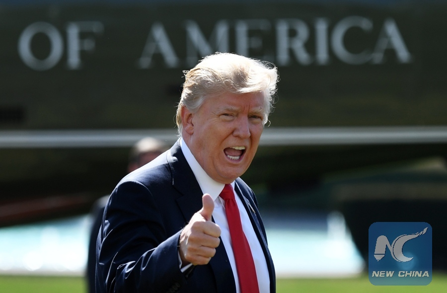 U.S. President Donald Trump walks to the Oval Office after returning to the White House in Washington D.C., the United States, Feb. 24, 2017. (Xinhua/Yin Bogu)