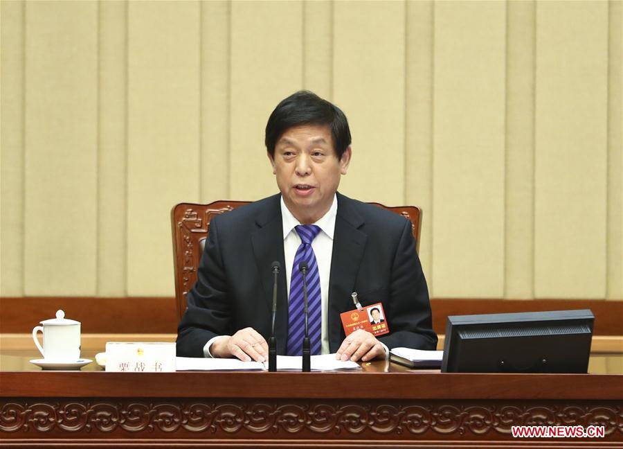 Li Zhanshu, executive chairperson of the presidium of the first session of the 13th National People's Congress (NPC), presides over the sixth meeting of the presidium at the Great Hall of the People in Beijing, capital of China, March 16, 2018. (Xinhua/Xie Huanchi)