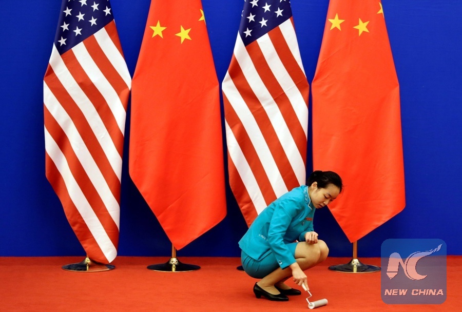 File Photo: An attendant cleans the carpet next to U.S. and Chinese national flags before a news conference for the 6th round of U.S.-China Strategic and Economic Dialogue at the Great Hall of the People in Beijing, July 10, 2014. (Xinhua/REUTERS)