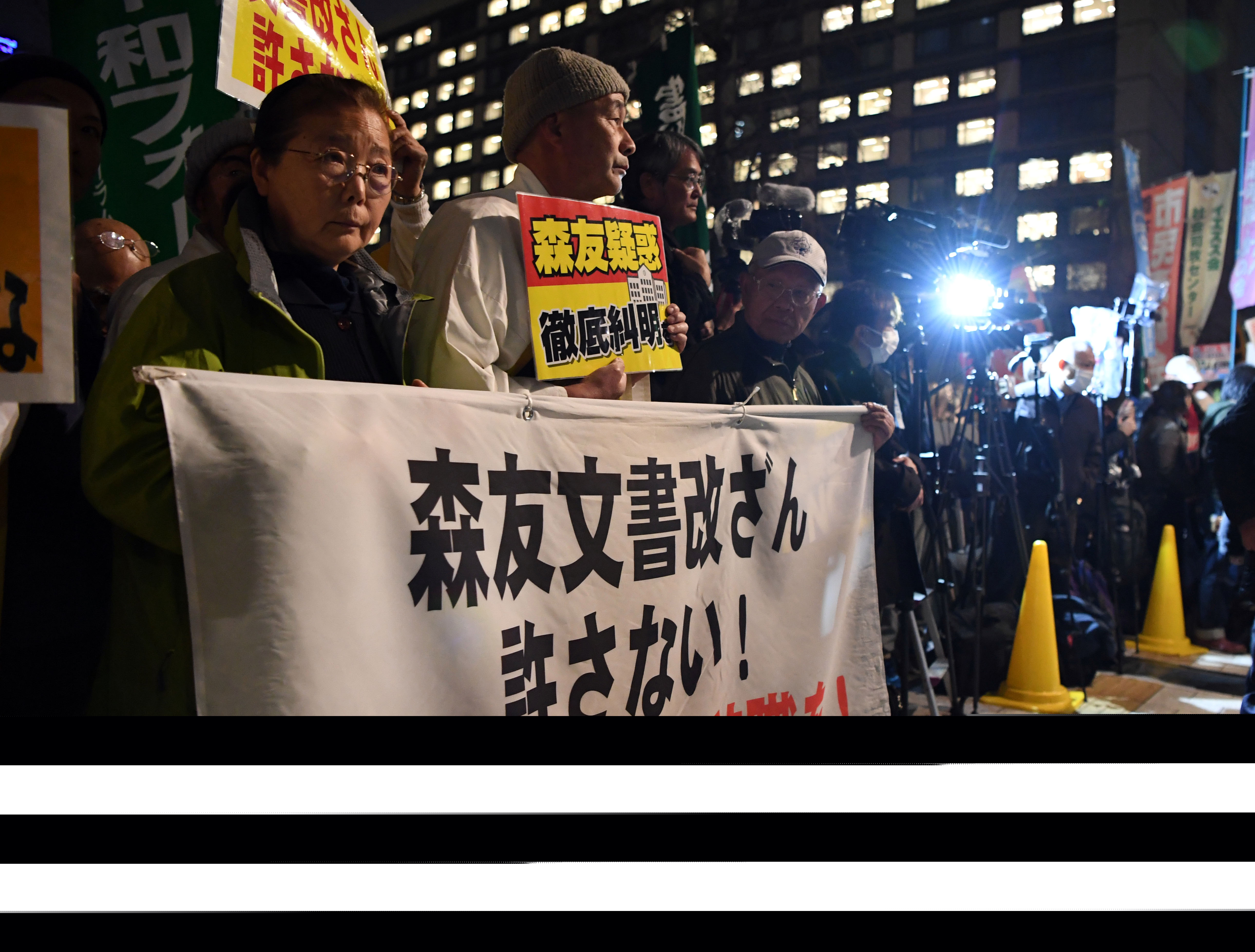 The protest was triggered by Abe's denial of either his or his wife's involvement in the cut-price land deal.