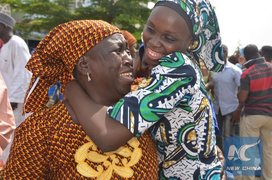 File photo shows a Chibok girl (R) released from terror group Boko Haram's captivity hugs her relative in Abuja, Nigeria, May 20, 2017.(Xinhua/Olatunji Obasa)