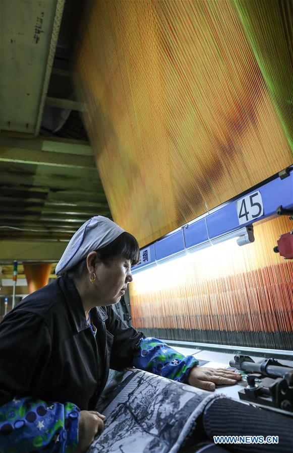 A worker checks the working of a modern weaving machine for Song brocade at the Wujiang Dingsheng Silk Company in Shengze Town, Suzhou City of east China's Jiangsu Province, March 31, 2018. Song brocade, dating back to the Song Dynasty (960-1127) in ancient China, was listed as the World Intangible Cultural Heritage in 2009. Dedicated in inheriting and developing of Song brocade, the Wujiang Dingsheng Silk Company has applied the brocade to the making of products such as bags, boxes, clothing and handicrafts. (Xinhua/Yang Lei)