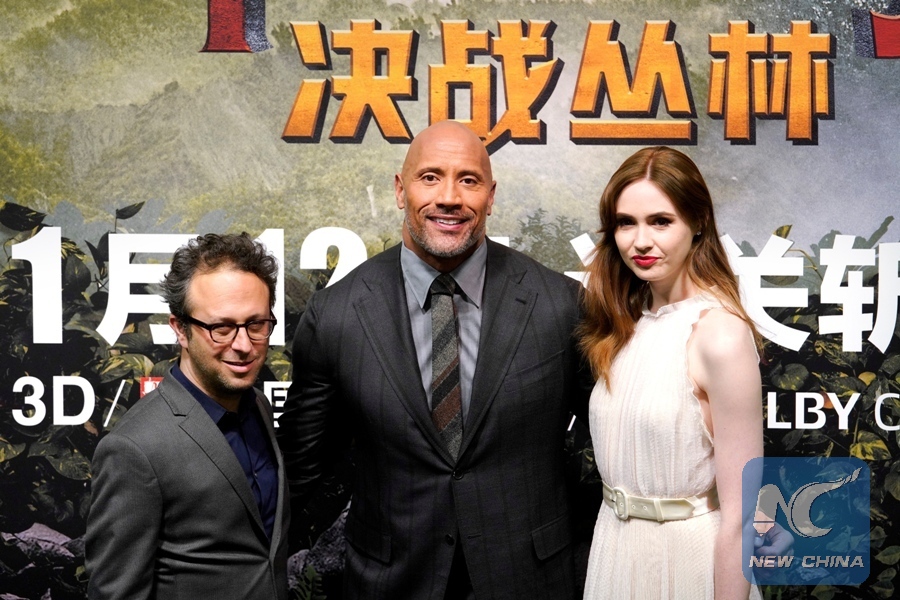 Director Jake Kasdan (L), cast members Dwayne Johnson (C)and Karen Gillan attend a news conference promoting their film "Jumanji: Welcome to the Jungle" in Beijing, China, Jan. 4, 2018. (Xinhua/REUTERS)