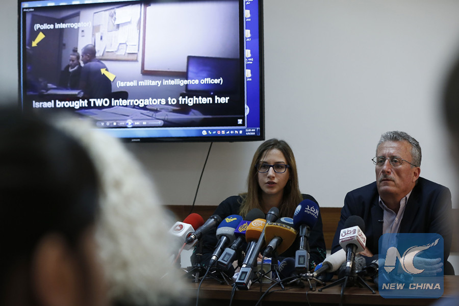 RAMALLAH, April 9 (Xinhua) -- A video revealed on Monday morning shows two Israeli interrogators harassing and threatening the Palestinian teenager resistance icon Ahed Tamimi.