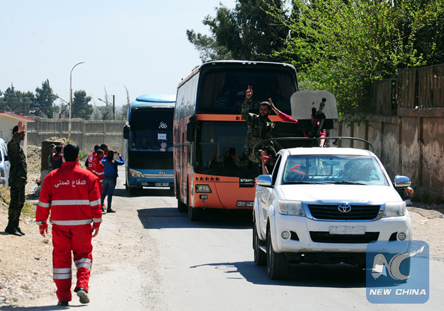 Buses transporting rebels evacuated from the Douma district are seen at a crossing in the Wafideen area in northeast of Damascus, capital of Syria, on April 2, 2018. (Xinhua/Ammar Safarjalani)