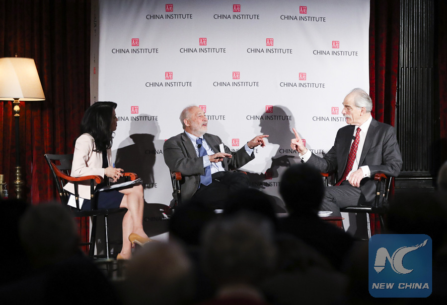 Nobel Prize-winning American economist Joseph Stiglitz (C, Rear) and John Lipsky (R, Rear), distinguished scholar, School of Advanced International Studies, Johns Hopkins University, attend a panel discussion, part of the China Institute 2018 Executive Summit, "U.S.-China Business in the New World Order," in New York, the United States, on April 12, 2018. (Xinhua/Wang Ying)