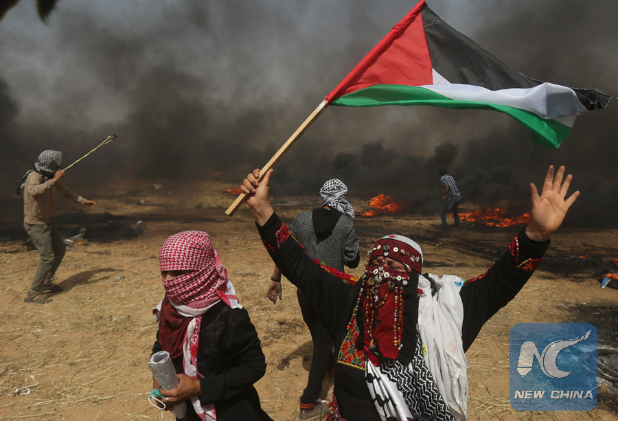 A Palestinian woman holds national flag during clashes with Israeli troops on the Gaza-Israel border, east of Khan Younis in the southern Gaza Strip on Apr. 13, 2018. (Xinhua/Yasser Qudih)