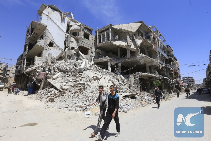 People are seen walking in Douma on the outskirts of Damascus on April 16, 2018 during an organised media tour after the Syrian army has declared that all anti-regime forces have left Eastern Ghouta, following a blistering two month offensive on the rebel enclave on the outskirts of the capital. (AFP Photo)