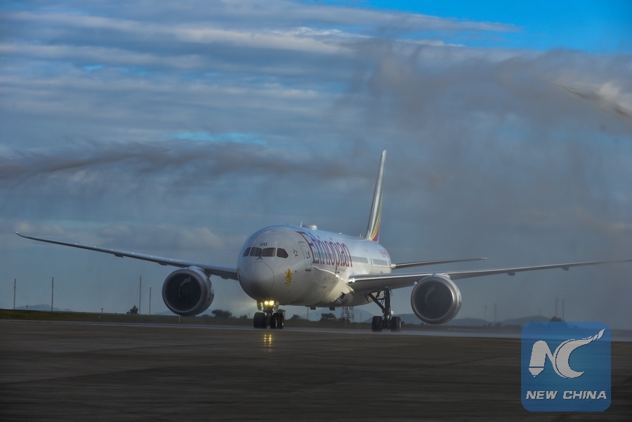 Photo taken on Oct. 27, 2017 shows the first Boeing 787-9 Dreamliner at Bole International Airport in Addis Ababa, capital of Ethiopia. Ethiopian Airlines, the largest airline group in Africa, will become the first on the continent to receive and operate the Boeing 787-9 Dreamliner. (Xinhua/Michael Tewelde)