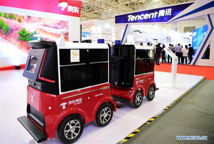 A driverless delivery car is displayed during the Digital China Exhibition in Fuzhou Strait International Conference and Exhibition Center in Fuzhou, capital of southeast China's Fujian Province, April 21, 2018. The exhibition opened here on Saturday, during which 293 exhibitors will display the latest digital economy achievements. (Xinhua/Wei Peiquan)